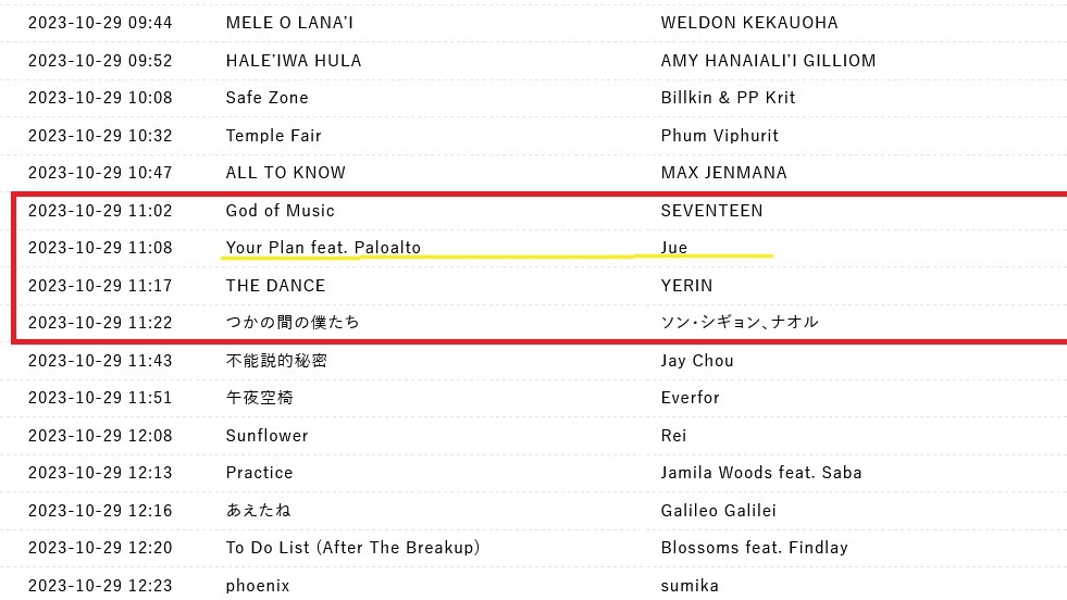 黄色の下線を引いた曲がわたしのリクエストした曲。っていってももうradikoタイムフリーも終わっちゃったし証拠があるかと言われればないんだけど。